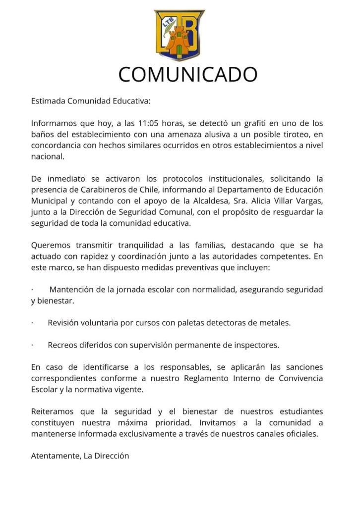 La dirección hizo un llamado a la tranquilidad de las familias y apoderados. Destacaron que el trabajo conjunto con los organismos de seguridad busca garantizar un entorno protegido para todos.
