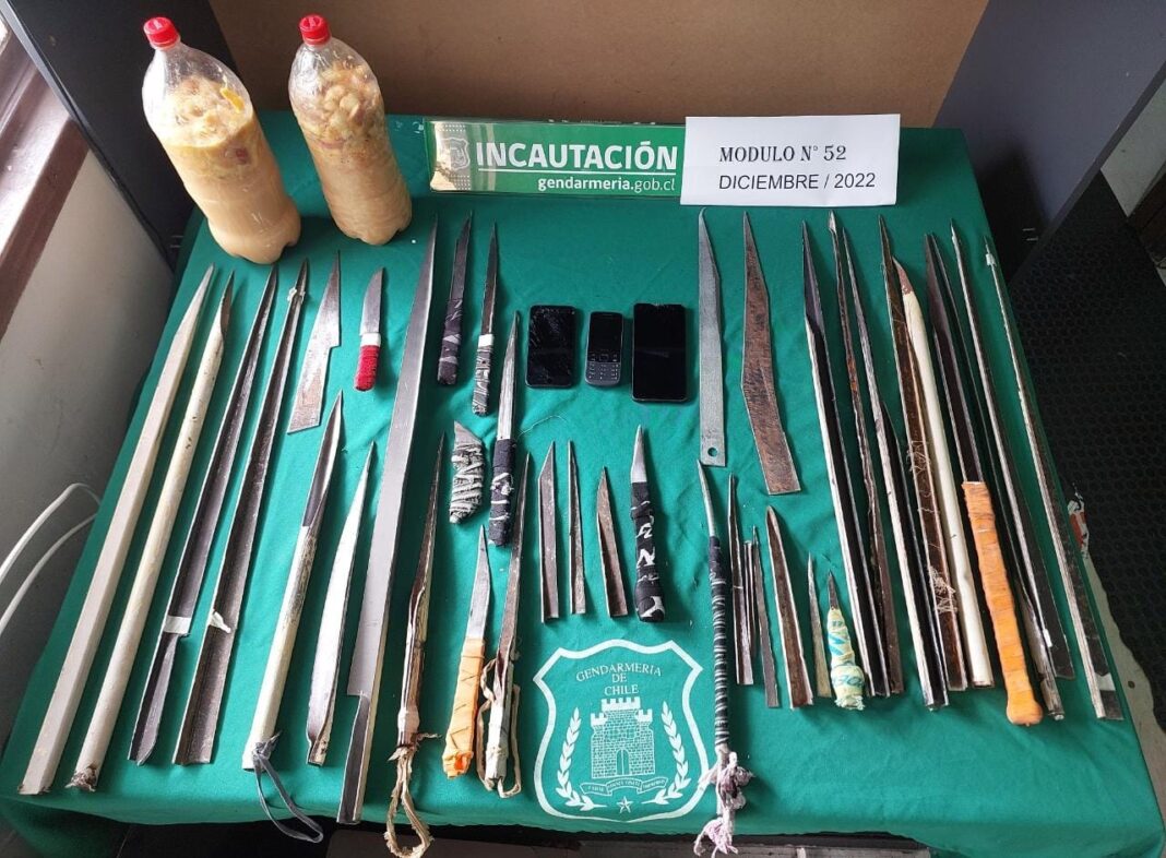 En el módulo 52 de Alto Bonito, que alberga a 135 internos de mediano compromiso delictual, se incautaron 38 armas blancas de confección artesanal, 6 litros de licor artesanal y 3 teléfonos celulares.