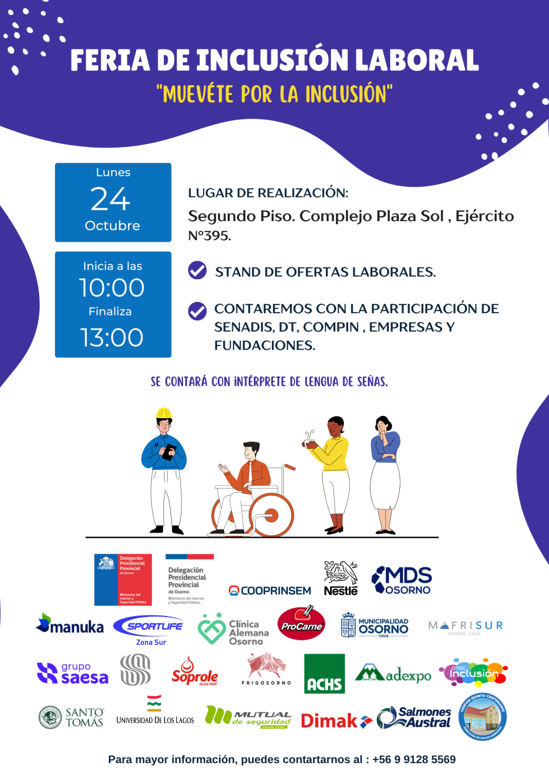 La iniciativa, propuesta por empresas de la comuna, busca promover la incorporación de personas con discapacidad y grupos en vías de integración al mundo laboral.Un total de 20 empresas participarán el próximo lunes 24 de octubre en la primera Feria de Inclusión Laboral en la ciudad de Osorno, con el objetivo de promover la incorporación de las personas con discapacidad al mundo laboral.La Feria contará con la participación de la Delegación Provincial, Municipalidad de Osorno, Seremía del Trabajo, Senadis, Compin y otras fundaciones del área comprometidas con el área laboral.La organizadora del evento, Tamara Ponce, señaló que la instancia permitirá socializar la información más relevante por parte de servicios y fundaciones que trabajan por la inclusión y a su vez es una oportunidad para informar sobre los cargos vacantes disponibles en cada empresa.La Ley de Inclusión Laboral establece que las empresas que cuentan con más de 100 trabajadores deberán tener al menos el 1% de su dotación en situación de discapacidad.Entre las empresas que estarán presentes en la Feria se encuentran Manuka, Sportlife, Clínica Alemana, Municipalidad Osorno, Casino Marina Del Sol, Nestlé, Grupo Saesa, Sonesta, Prolesur, Cooprinsem y Dimak, este último, organizador del evento.