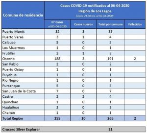 Fuente: Unidad de Epidemiología, Departamento de Salud de Poblaciones, SEREMI de Salud Los Lagos.  Respecto a casos fallecidos por COVID-19, se han informado 2 fallecimientos, de la comuna de Osorno, los cuales corresponden a pacientes adultos mayores con patologías crónicas, uno de ellos se encontraba hospitalizado en la UCI de la Clínica Alemana de Osorno conectado a ventilador mecánico y la otra paciente en Hospital Base de Osorno no conectada a ventilador por LET (limitación del esfuerzo terapéutico).