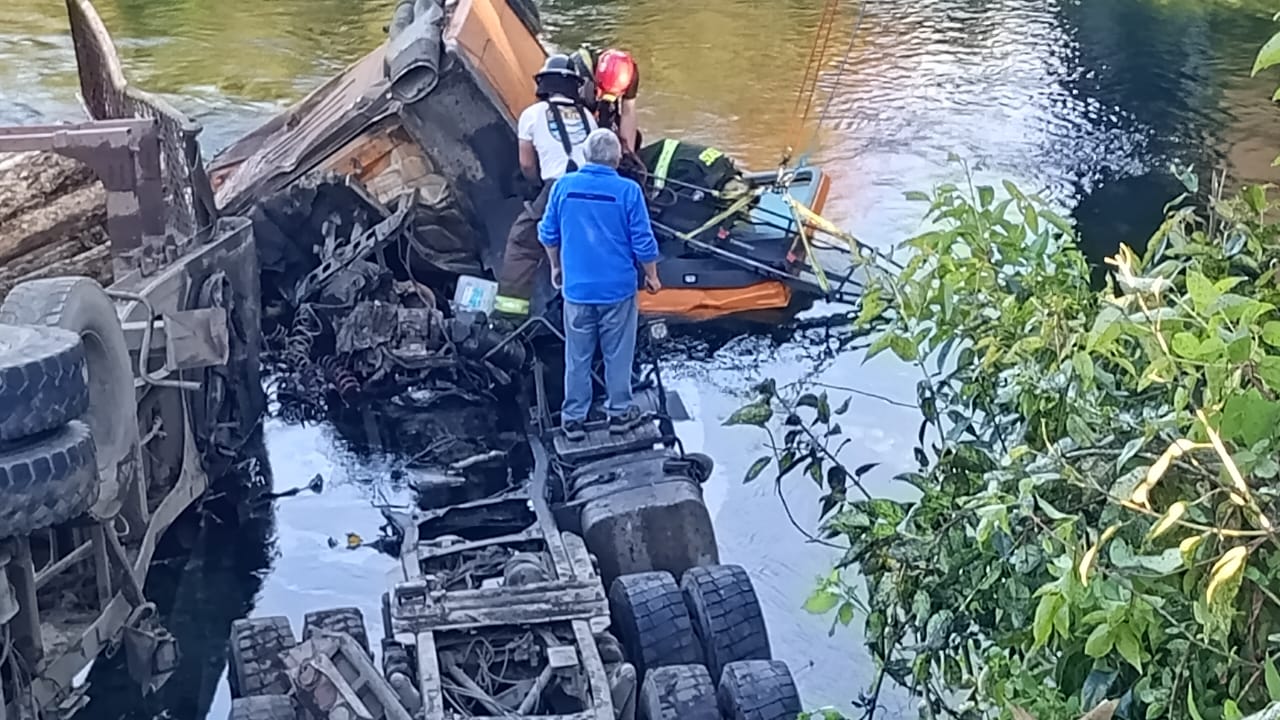 La mañana de este miércoles, un camión de carga forestal cayó desde el puente Descarga, ubicado sobre el río Calcurrupe, en el kilómetro 87 de la Ruta T-85, sector Calcurrupe Bajo, en la comuna de Lago Ranco.