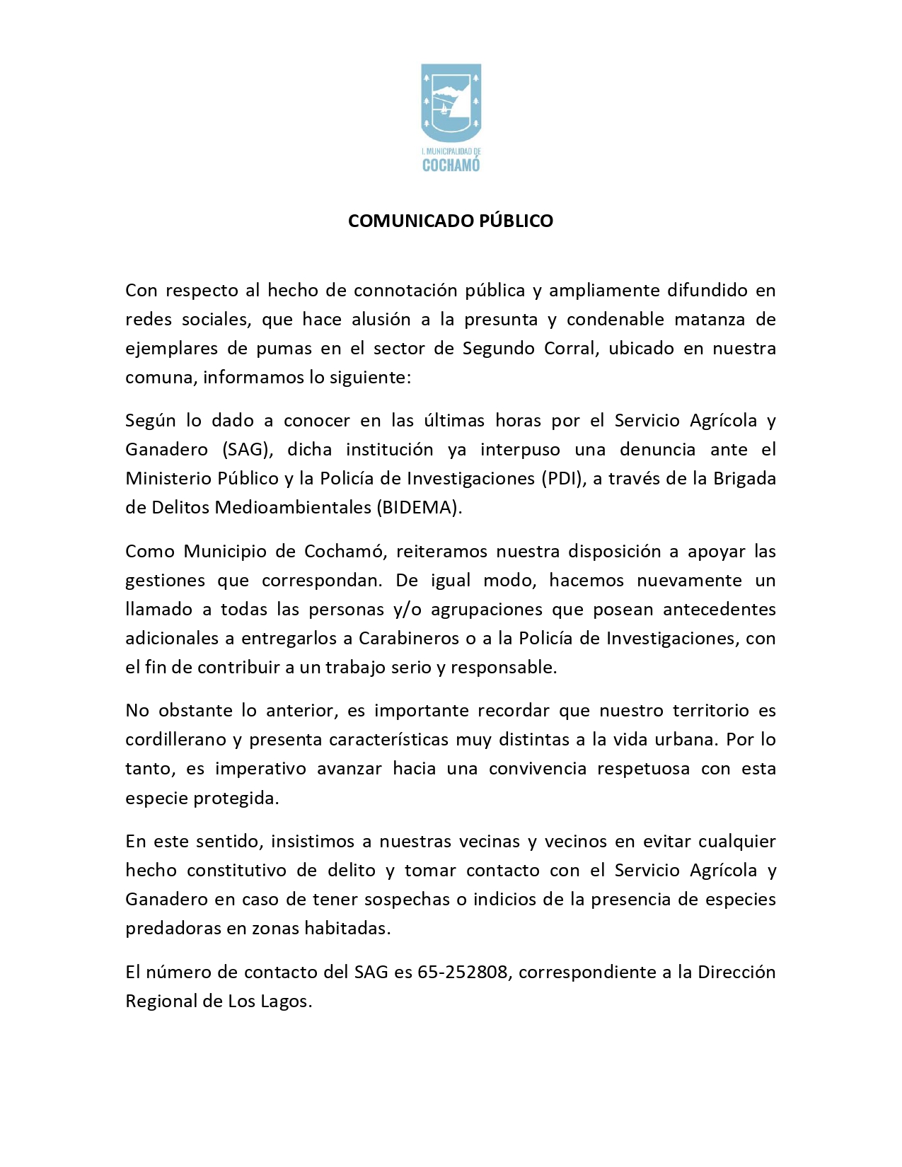 La Municipalidad de Cochamó informó que, tras las denuncias por la presunta matanza de pumas en Segundo Corral, el SAG presentó una denuncia formal ante el Ministerio Público y la PDI. El municipio reiteró su disposición a colaborar con las investigaciones e hizo un llamado a quienes tengan antecedentes a entregarlos a las autoridades. Además, recordó la importancia de convivir responsablemente con esta especie protegida e instó a la comunidad a evitar acciones que constituyan delito, contactando al SAG ante cualquier indicio de fauna predadora en zonas habitadas.