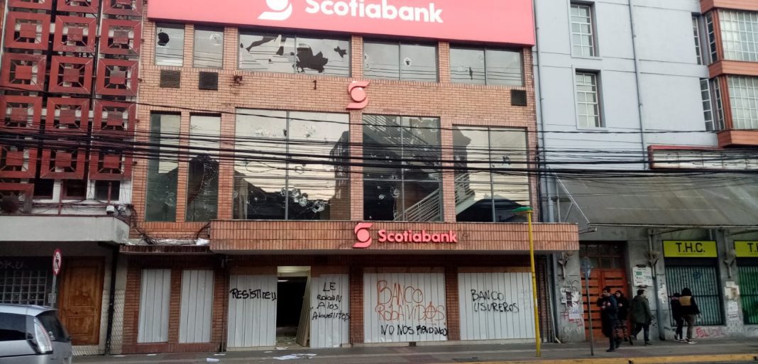 La situación se tornó mucho más violenta cuando un grupo de desconocidos ingresó y saqueó el Banco Scotiabank, el Banco Itaú, y la farmacia Salcobrand, ubicados a pasos de la plaza de armas.