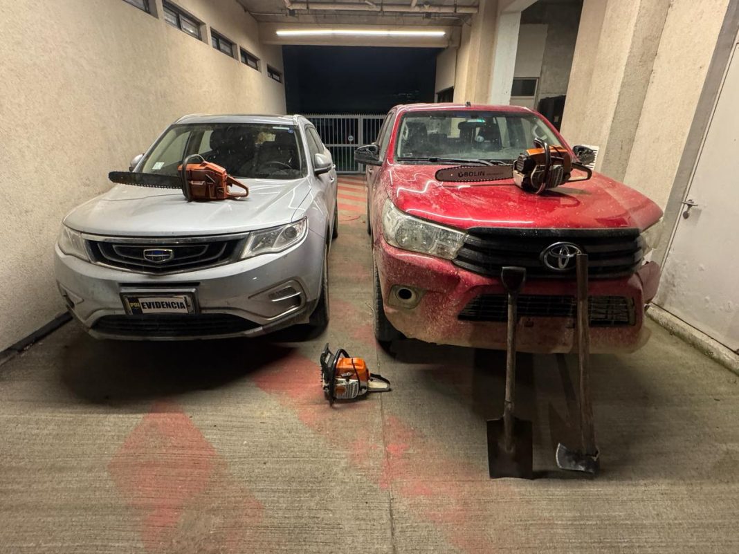 La detención de estas personas se realizó la tarde de este miércoles, logrando el decomiso de dos vehículos menores, un camión con carro y pluma, motosierras y diversas herramientas para el corte y tala de árboles, cuyo avalúo bordea los $65 millones de pesos.