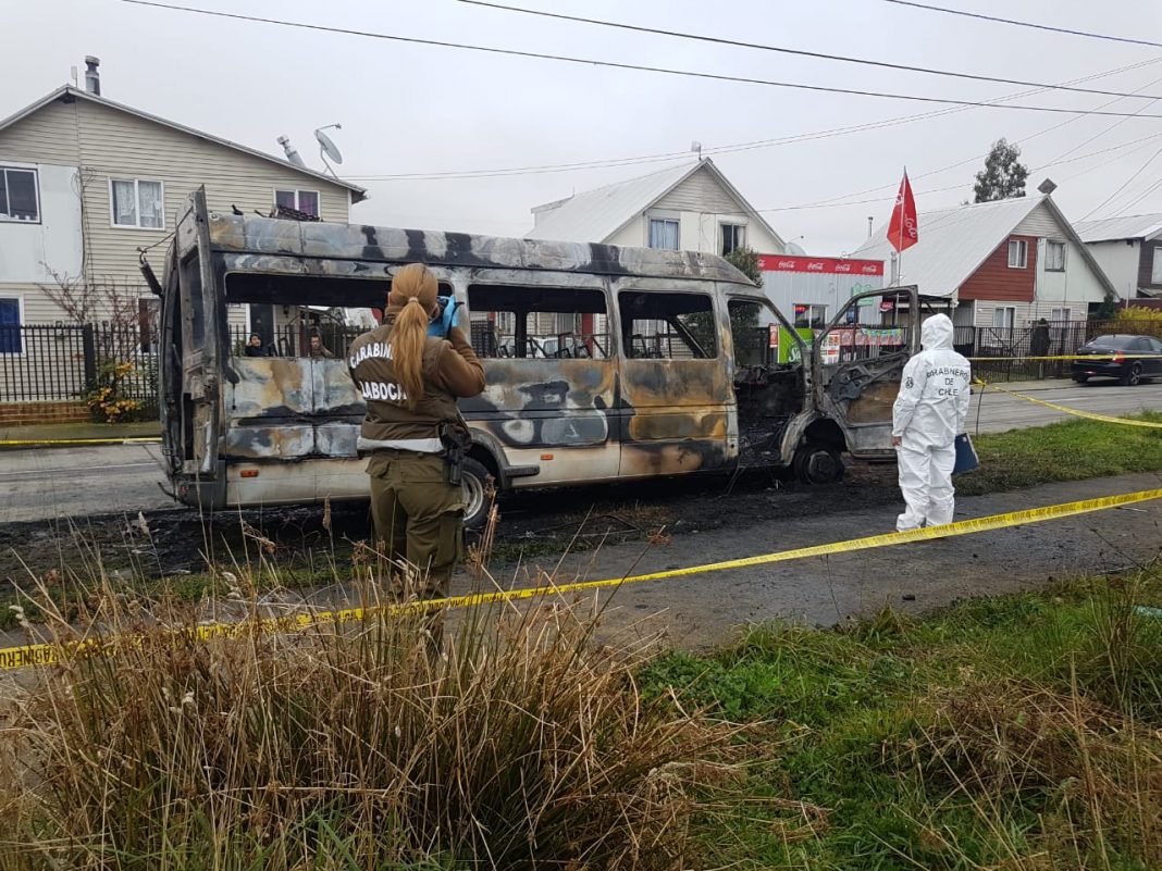 La Fiscalía local de Puerto Montt, solicitó al personal del Laboratorio de Criminalística de Carabineros, LABOCAR, realizar peritajes a un furgón de transporte escolar que resultó completamente destruido por la acción del fuego, luego que en horas de la madrugada este se incendiara presuntamente de manera intencional por sujetos desconocidos.