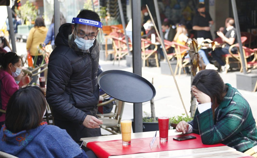 Un garzon atiende bajo normas de seguridad con mascarilla facial, durante la nueva forma de atender a publico abren sus puertas los restaurant del Barrio de Ñuñoa
