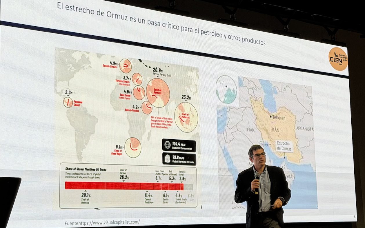 El vicepresidente del Banco Central, Alberto Naudon, presentó esta mañana en Osorno un detallado informe acerca el actual escenario macroeconómico nacional, el cual está fuertemente marcado por la tensión geopolítica internacional derivada del conflicto en Medio Oriente.